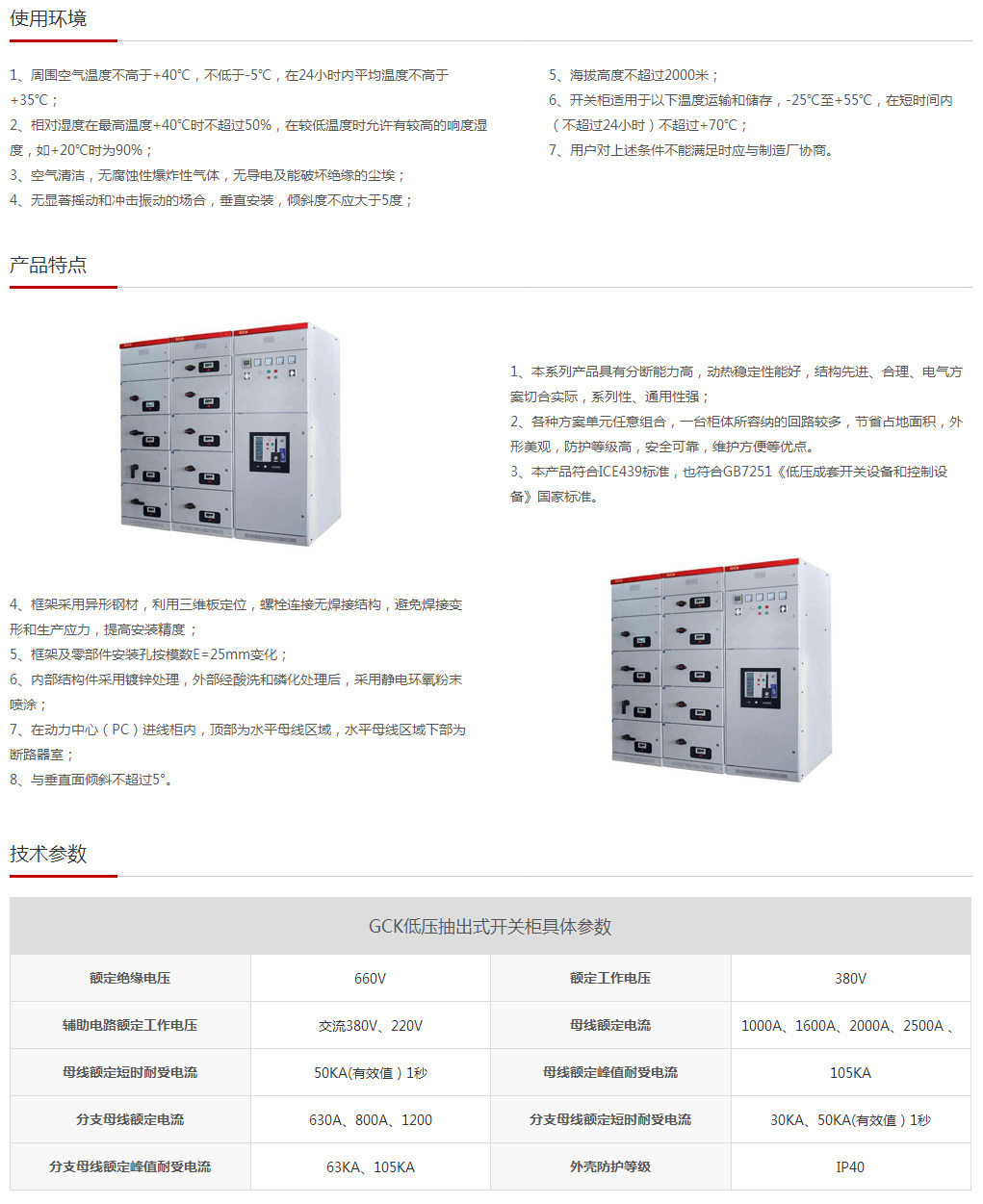 GCK低壓抽出式開(kāi)關(guān)柜廣泛應(yīng)用于發(fā)電廠,變電所,廠礦企業(yè)和高層建筑的動(dòng)力配電中心PC和電動(dòng)機(jī)控制中心MCC,作為交流50-60Hz,額定工作電壓為660V及以下,額定電流為4000A及以下的發(fā)、供電系統(tǒng)中配電、電動(dòng)機(jī)集中控制,無(wú)功補(bǔ)償使用的低壓成套配電裝置??捎糜诎l(fā)電廠、變電所、工礦企業(yè),大樓賓館、機(jī)場(chǎng)、碼頭以及廣播電視等通信中心,來(lái)作為發(fā)電、輸配電、電能轉(zhuǎn)換及電能消耗設(shè)備的控制,并通過(guò)電容補(bǔ)償柜