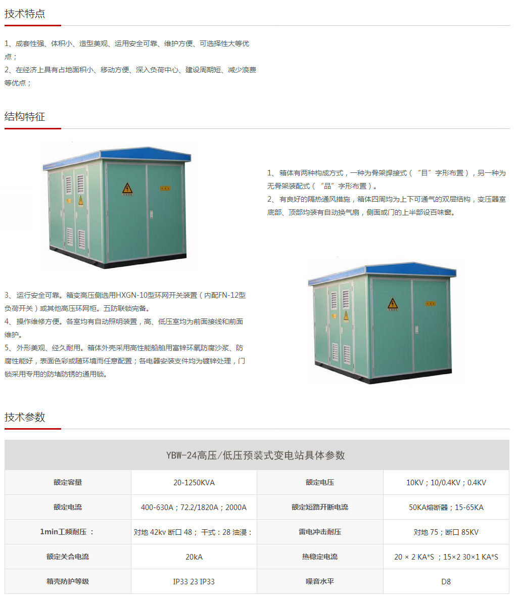 YBW-24高壓/低壓預(yù)裝式變電站分為高壓室、變電器室、低壓室三大部分。預(yù)裝式變電張將高壓開(kāi)關(guān)設(shè)備、變壓器、低壓開(kāi)關(guān)設(shè)備和其他附屬電器元件組合成能適應(yīng)戶外運(yùn)行環(huán)境;能獨(dú)立完成電壓變換和電能保護(hù)、控制、分配等功能。產(chǎn)品多樣化設(shè)計(jì),組合靈活方便,適合配電網(wǎng)絡(luò)節(jié)點(diǎn)和終端使用,具有結(jié)構(gòu)緊湊、安全可靠、占地少、造價(jià)低等優(yōu)點(diǎn)。該裝置適用于額定電壓(≤10KV)三相交流系統(tǒng)中作為接受和分配電能之用。特別適用于城